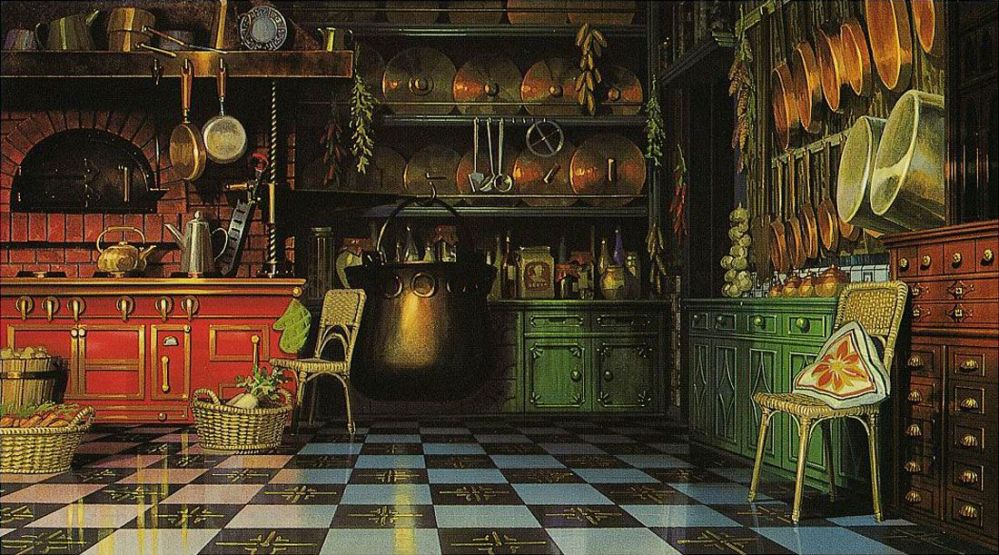 Empezando con la cocina de la bruja Yubaba en El viaje de Chihiro (2001) la cual cuenta historia de la pequeña Chihiro en el mundo de los espíritus, esta cocina tiene algo en particular si te fijas en este detalle te darás cuenta que eso pasa con la mayoría de lugares en esta cinta y es que su escala es un poco mas grande que la de costumbre, Esto puede ser que la arquitectura no esta diseñada para los humanos sino que para los espíritus.