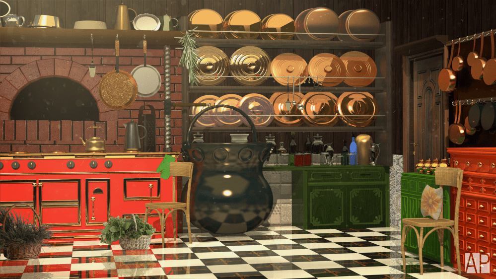 El amor al oro de la bruja se refleja en la cocina con detalles dorados y brillantes en detalles y accesorios, algo que también le agrega personalidad al ambiente es la iluminación, en la escena se puede ver que no tiene iluminación natural directa, la cual obliga a usar iluminación creada o artificial pero esta siempre le da un toco más oscuro y tenebroso.